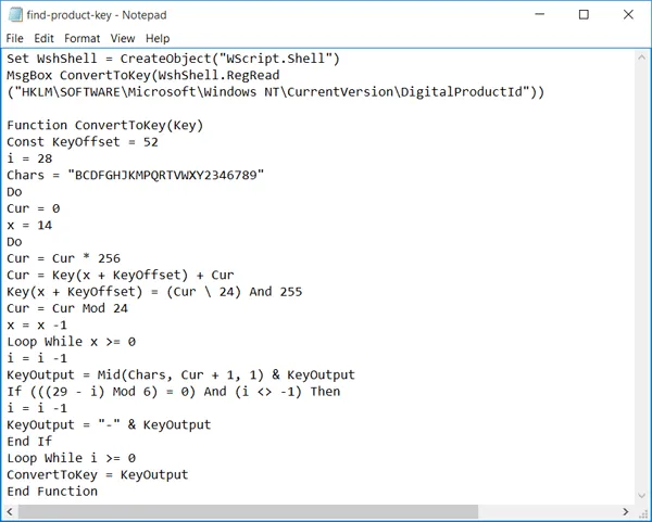 You can get the product key by using Visual Basic Script (VBS). You need to copy the code (attached here) and paste it on notepad and save it as .vbs.