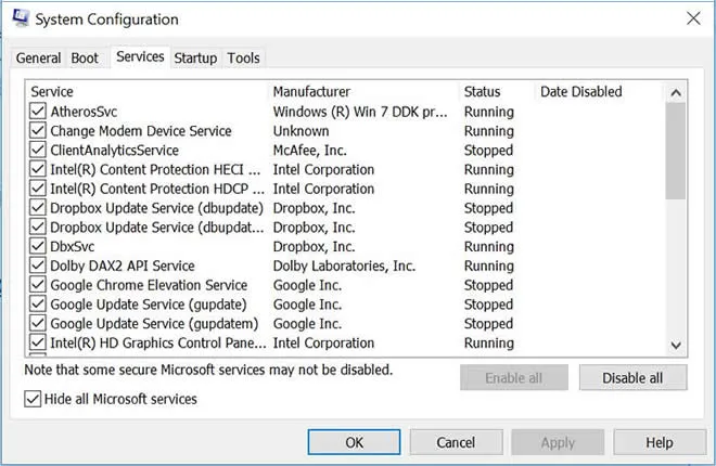 Step 3. Activate the tab "Services" and check the box next to "Hide all Microsoft services" after it. Hit the option "Disable all", then select to "Apply" and click on "OK" to save the changes.